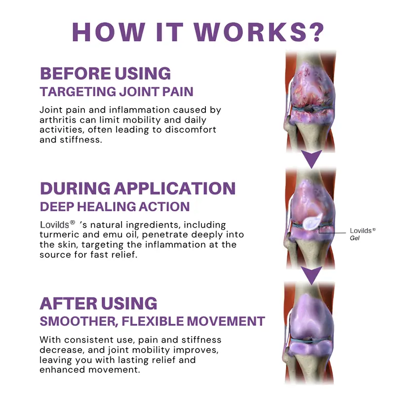 “After years of struggling with knee pain and major swelling, myknees were so inflamed that my mates joked they looked like footyballs.When l came across the LOVILDS™ Turmeric & Emu Oil Arthritis Soothing Pain Relief Massage Gel, l decided to give it a go without a secondthought. To my surprise, in just under three weeks l saw incredibleimprovements; my knee pain eased significantly and the swellingvanished.i’m now fully recovered and incredibly grateful for thiscream.lt’s made a massive difference in my life.”-Mia Johnson