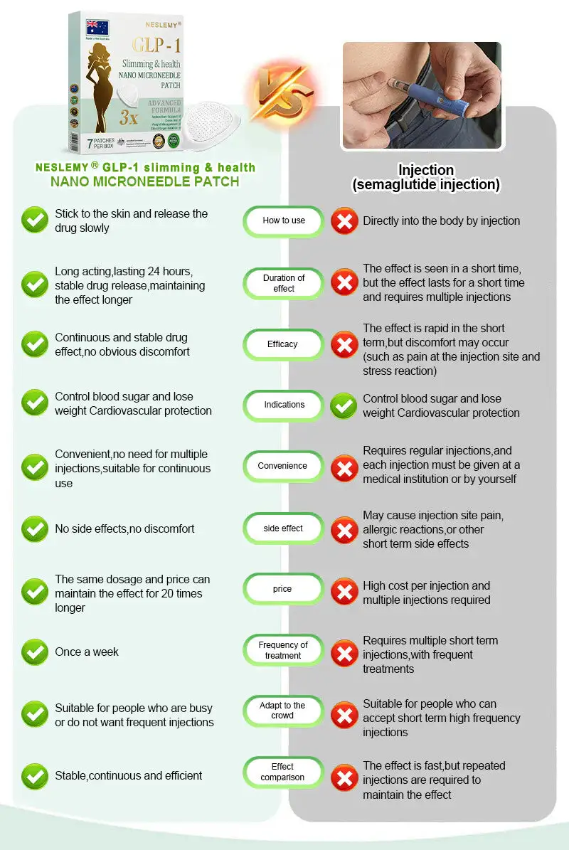 The NESLEMY® Tirzepatide Nano Microneedle Patch offers a long-lasting. slow release of the medication. ensuring a stable effect over 24 hours without causing any discomfort. With the same dosage and price. it can maintain up to 20 times longer-lasting effects (similar to the difference between an IV drip and a single injection).