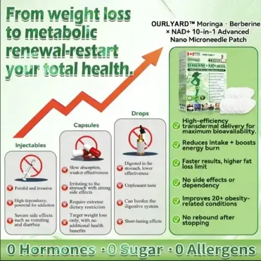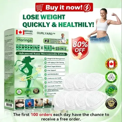 Ourlyardโข๐ด๐๐๐๐๐๐ฎ ยท ๐๐ฒ๐ฟ๐ฏ๐ฒ๐ฟ๐๐ฃ๐ ร ๐๐ผ๐+ ๐๐-๐ข๐ง-๐ ๐๐ฑ๐๐ฎ๐ป๐ฐ๐๐ ๐๐๐ฃ๐ค ๐๐๐๐ง๐ค๐ฃ๐๐๐๐ฅ๐ ๐๐๐ญ๐๐ ย was developed through more than 20 years of research by a multidisciplinary team of over 30 experts. Each patch incorporates an ultra-fine microneedle architecture measuring approximately one-seventh the thickness of a human hair. designed to ensure a smooth and virtually painless application. The formulation contains highly concentrated natural bioactive compounds. up to 20-fold higher than conventional market levels. including Moringa and Berberine. which act synergistically to support healthy glycemic responses. appetite regulation. and lipid metabolism. thereby promotingย gradual and sustainable weight management. Enriched withย NAD+.the patch further supportsย skin firmness and structural resilience during body-weight fluctuations. helping maintain a lean appearance without compromising comfort or aesthetics. Additional high-efficacy components contribute to the support ofย immune function. digestive health. gut balance. womenโs health. daily energy levels. and fatigue reduction. collectively promoting a more youthful and resilient physiological state from within.ย This product meets the quality standards of the Canadian Health Discussionย Organizationย and requires no injections. Based on scientific principles. it provides aย safeย and comprehensive approachย to effectively control weight and promote long-term metabolic health. designed to workย in harmony with the body rather than against it.